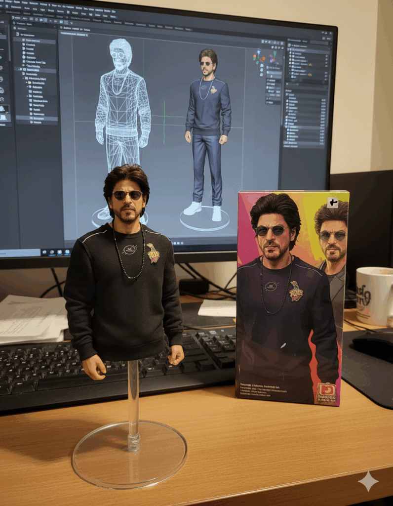 - You’ll now see a realistic figurine image placed on a computer desk with 3D modeling details and a toy packaging box beside it.