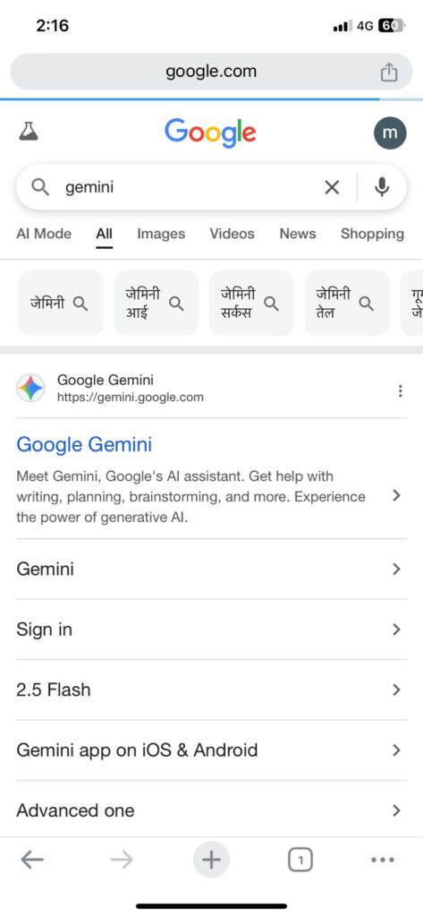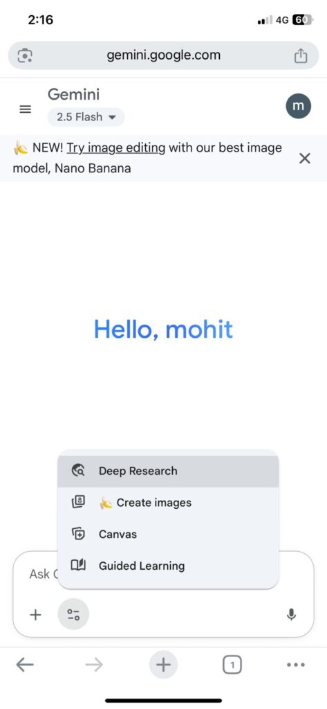 - You’ll see the Gemini dashboard with different modes like 2.5 Flash, Deep Research, and Create Images.